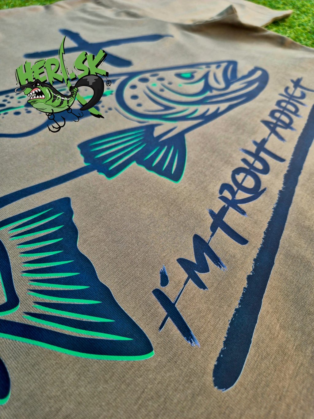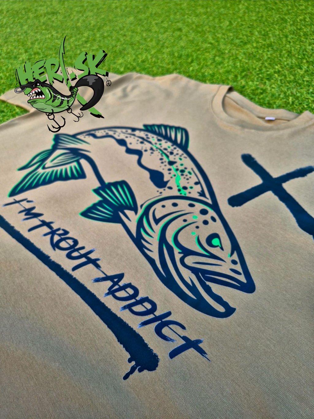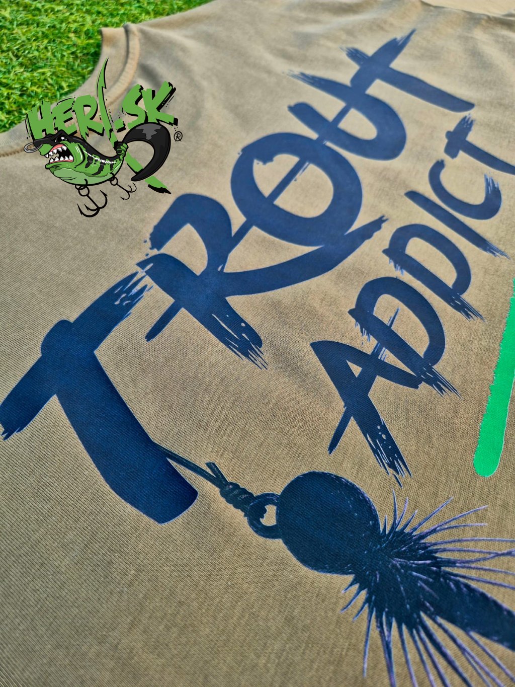 ✔️ Na chrbte výrazný nápis Trout Addict v čiernom brush štýle
