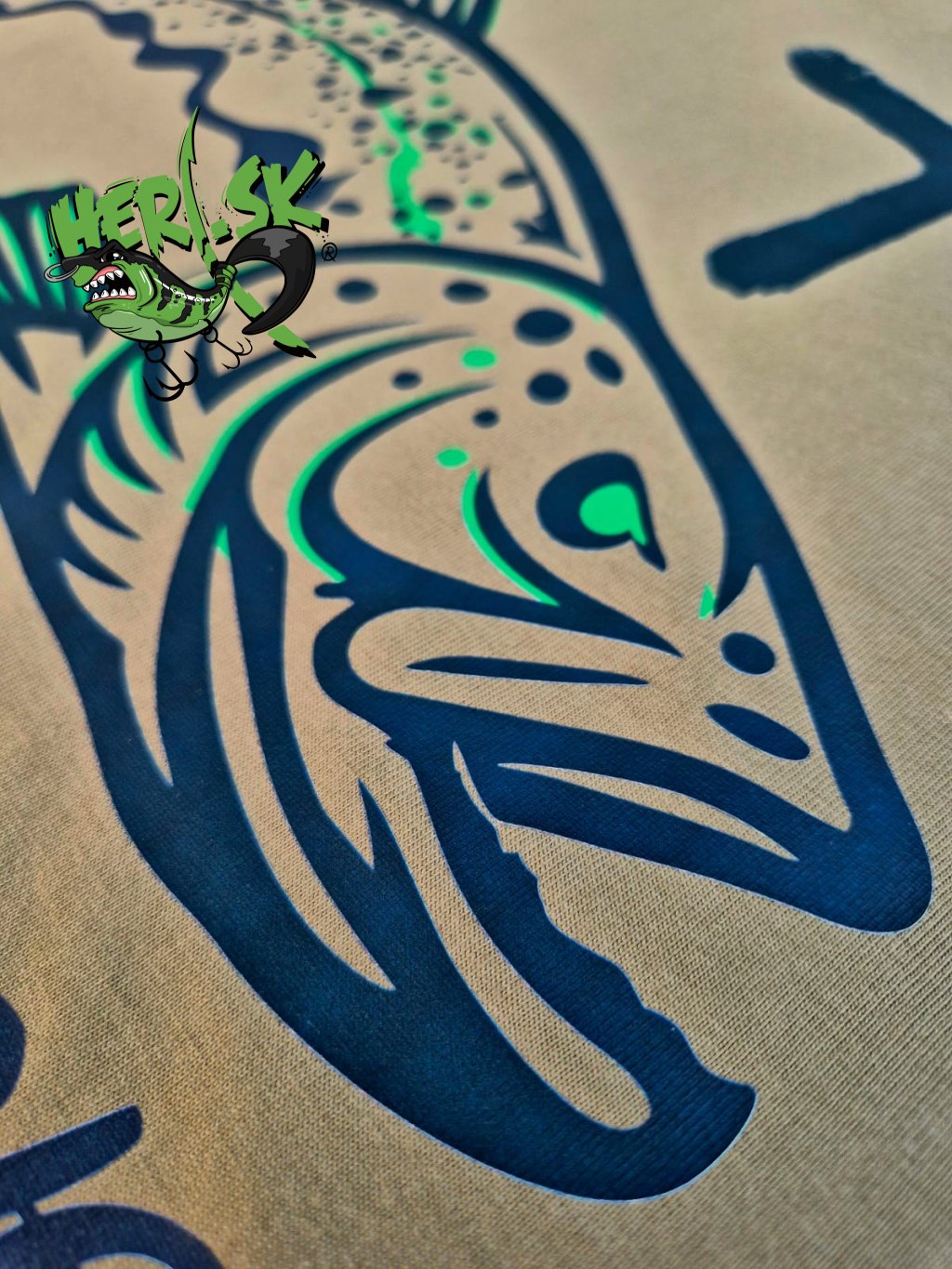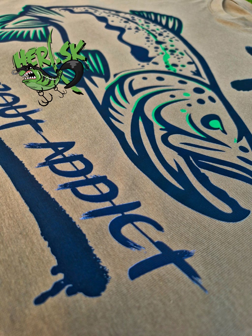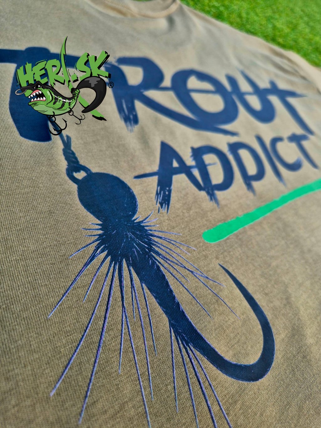 ✔️ Na chrbte výrazný nápis Trout Addict v čiernom brush štýle